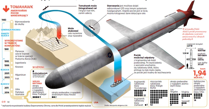 Tomahawki to amerykańskie pociski samosterujące, których Stany Zjednoczone po raz pierwszy użyły przeciw Irakowi na początku lat 90. podczas operacji Pustynna Burza. Broń ta jest na wyposażeniu jedynie USA i najbliższego sojusznika Waszyngtonu w Europie – Wielkiej Brytanii. O jej zakup pyta również Polska.