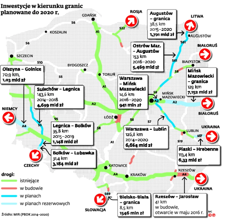 Z projektu rządowego programu budowy dróg (PBDK) 2014–2020 r. wynika, że małe są szanse budowy autostrady A2 w kierunku granicy z Białorusią. Do 2020 r. rząd zaklepał tylko 15-kilometrowy odcinek z Warszawy do Mińska Mazowieckiego (odcinki do Siedlec i Terespola są na liście rezerwowej). Adrian Furgalski z Zespołu Doradców Gospodarczych TOR twierdzi, że to dobrze, bo tranzyt A2 na Wschód jest mitem: większość zatrzymuje się na linii Wisły, a reszta jedzie przez Litwę. Dlatego trzeba budować w tę stronę. – Wszystkie brakujące odcinki dróg ekspresowych S61 i S8, stanowiące przebieg Via Baltica w stronę Litwy, znajdują się na liście podstawowej projektu PBDK – podkreśla Piotr Popa z MIR.
