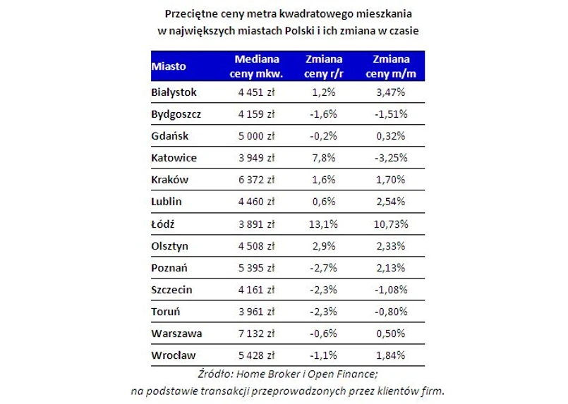 Na liście miast z najwyższymi stawkami za metr kwadratowy mieszkania zaszła zmiana na trzecim miejscu. Rok temu trzecim najdroższym miastem był Poznań, ale dziś jest to Wrocław. Najdrożej jest oczywiście w Warszawie, która zdecydowanie wyprzedza Kraków i pozostałe miasta. Oprócz czterech w/w ośrodków średnio co najmniej 5 tys. zł za metr trzeba jeszcze wydać w Gdańsku. Z kolei stawki poniżej 4 tys. zł, poza wspomnianą Łodzią, zanotowaliśmy w Katowicach i Toruniu.