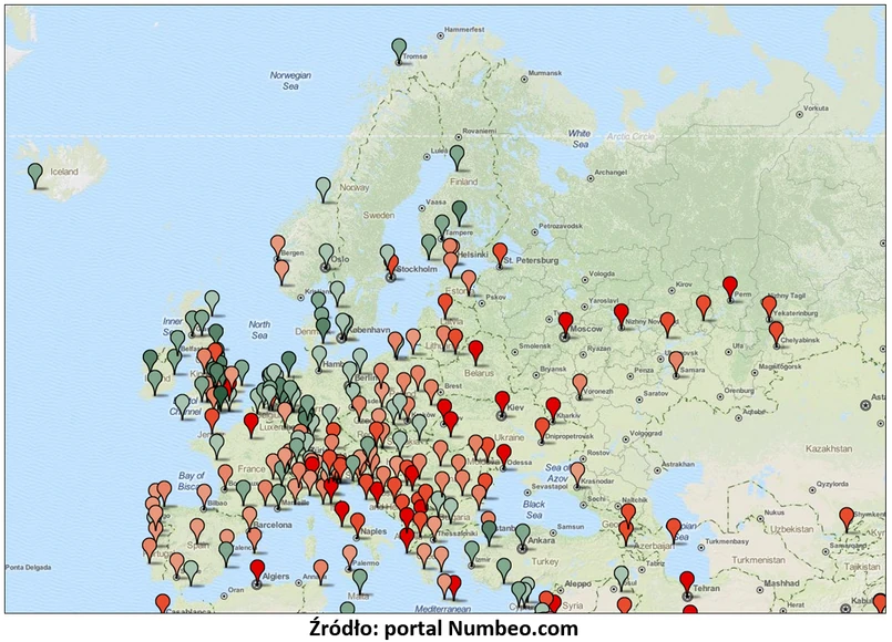 Wspomniany portal prezentuje m.in. dane na temat dostępności mieszkań w 183 miastach Starego Kontynentu. Po przeanalizowaniu różnic widocznych na mapie obok, można dostrzec pewną prawidłowość. Najlepszą dostępnością metrażu (kolor ciemnozielony) cechują się miasta położone na terenie Skandynawii, Niemiec, Beneluksu oraz Wysp Brytyjskich. Zupełnie inna sytuacja panuje w metropoliach Europy Południowej oraz Środkowo – Wschodniej. Niską dostępnością mieszkań (kolor czerwony) wyróżniają się też niektóre stolice z krajów „starej Unii” (np. Londyn, Paryż, Rzym).