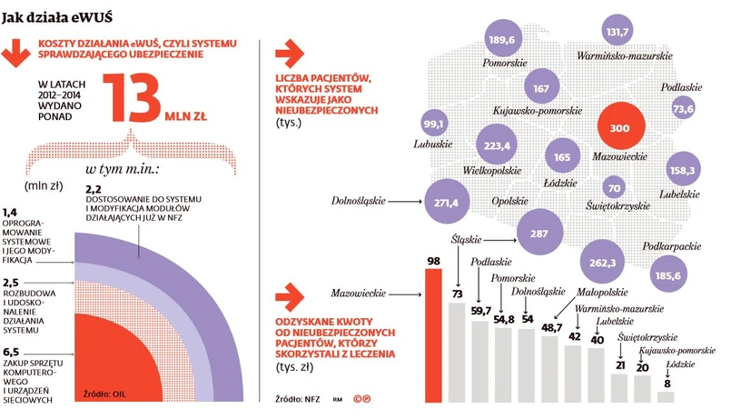 Koszt systemu e-WUŚ weryfikującego prawa pacjentów do bezpłatnego leczenia wyniósł 13 mln zł. Na razie zyski z niego to około 500 tys. zł. Tyle udało się ściągnąć Narodowemu Funduszowi Zdrowia od chorych, którzy bez ubezpieczenia skorzystali ze świadczeń zdrowotnych. Z analizy DGP wynika, iż NFZ odzyskuje od kilkunastu do kilku procent długów w zależności od oddziału wojewódzkiego.