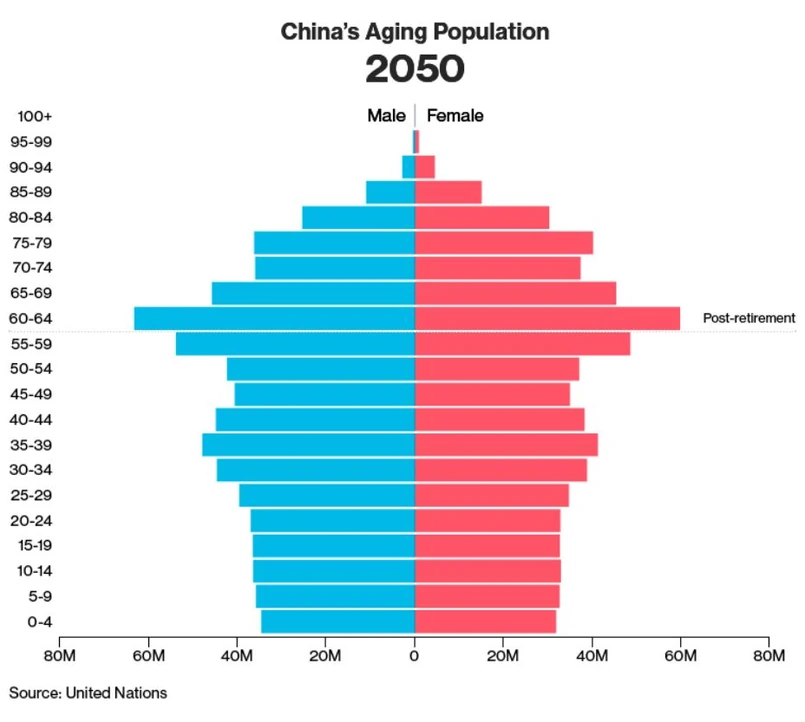 Chiny od reszty świata odróżnia jednak jedna rzecz – polityka jednego dziecka znacząco przyspieszyła proces starzenia się społeczeństwa w tym kraju. Za jej sprawą z demograficznego krajobrazu Chin zniknęły setki milionów nienarodzonych dzieci. Do 2050 roku odsetek osób powyżej 65. roku życia na 100 osób w wieku produkcyjnym wzrośnie trzykrotnie i wyniesie 39.