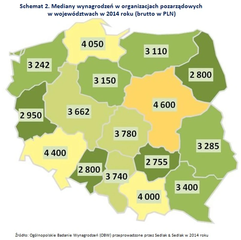 Najwyższe przeciętne wynagrodzenie otrzymywali pracownicy organizacji pozarządowych z województwa mazowieckiego – 4 600 PLN brutto miesięcznie. Wysokie mediany wynagrodzeń odnotowano również w województwach dolnośląskim (4 400 PLN), pomorskim (4 050 PLN), i małopolskim (4 000 PLN). Najniższe wynagrodzenia otrzymywali pracujący na terenie województwa świętokrzyskiego, mediana pensji wyniosła 2 755 PLN brutto. Przeciętne pensje, nie przekraczające 3 000 PLN odnotowano w województwach opolskim (2 800 PLN), podlaskim (2 800 PLN) i lubuskim (2 950).