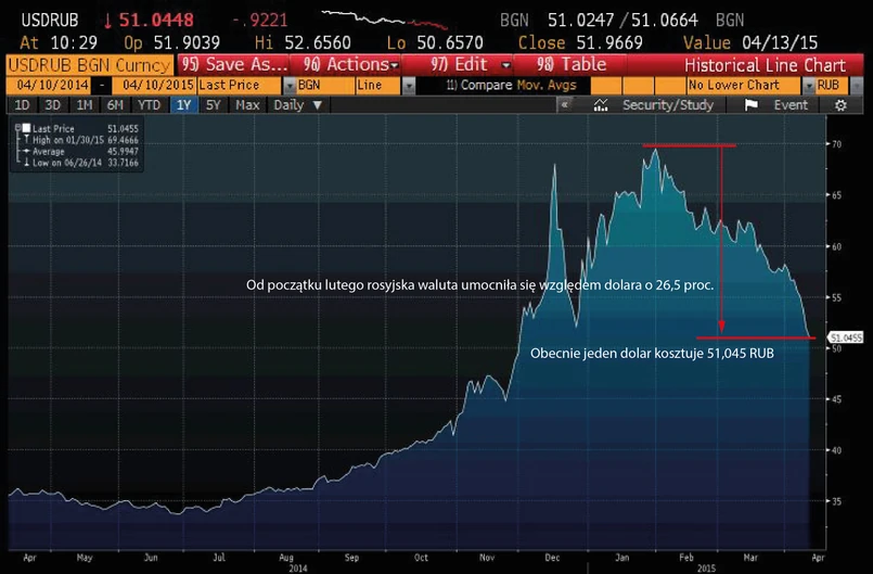 Rubel, który jeszcze w zeszłym roku był najsłabszą walutą, w tym roku radzi sobie najlepiej z głównych walut analizowanych przez Bloomberga. Mocny rubel to koło ratunkowe dla rosyjskich obligacji, których rentowności spadły do najniższego poziomu od 4 miesięcy. Z drugiej strony, silna waluta ogranicza dochody z rosyjskiego eksportu. Choć ceny ropy w dolarach nie zmieniły się w tym roku znacząco, kurs czarnego złota po przeliczeniu na ruble zanurkował do najniższego poziomu od 2011 roku.