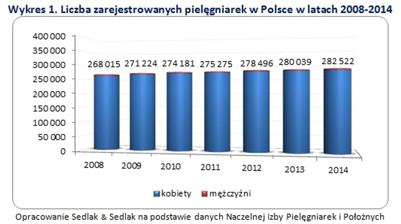 Pod koniec 2014 roku w Polsce zarejestrowanych było blisko 283 tys. pielęgniarek. Ponad 98% tej grupy zawodowej stanowiły kobiety. Na przestrzeni ostatnich lat liczba zarejestrowanych pielęgniarek nieznacznie wzrosła. W latach 2008-2014 liczba ta zwiększyła się z niecałych 267 tys. w 2008 roku do prawie 283 tys. w roku ubiegłym. Warto jednak pamiętać, że liczba czynnych zawodowo pielęgniarek w Polsce jest dużo mniejsza. Przykładowo liczba zatrudnionych pielęgniarek w 2013 roku wyniosła niecałe 213 tys., czyli o ponad 67 tys. mniej niż zarejestrowanych.