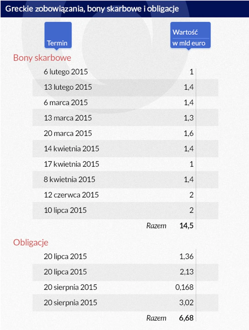 9 kwietnia 2015 r. Grecja z trudem, po trosze szantażując kredytodawców, spłaciła w końcu do MFW przypadającą na kwiecień ratę, ale już wkrótce czekają ją nowe spłaty. Terminarz spłat na „dojrzewające” obligacje i bony tylko rządu przedstawia się następująco: