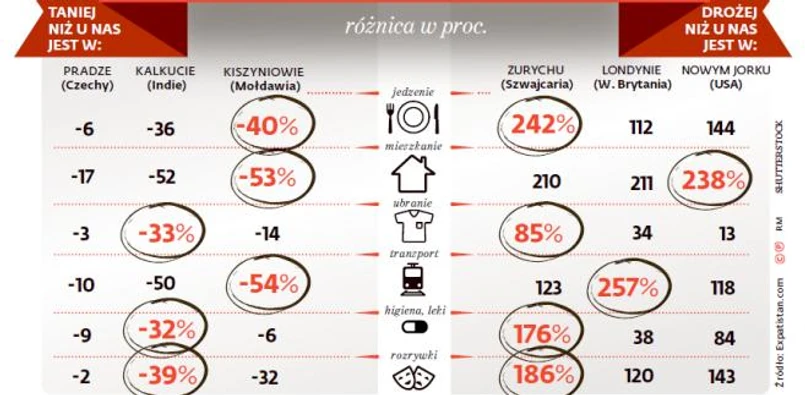 Miasta, w których życie jest najdroższe, to dziś szwajcarskie Zurych i Genewa, a w pierwszej dziesiątce mieszczą się jeszcze cztery metropolie amerykańskie, Londyn i Oslo, a także Singapur i Hongkong – wynika z porównania cen kilkudziesięciu produktów i usług w serwisie Expatistan.com. Ranking obejmuje 197 miast, w tym trzy polskie: Warszawa, Wrocław i Łódź znajdują się pod koniec zestawienia – wyprzedzają ośrodki z południowo-wschodniej Europy oraz Indie. Koszty życia w Zurychu są o 184 proc. wyższe niż w Warszawie, która z kolei jest o 10 proc. droższa niż czeska Praga i o 85 proc. droższa od najtańszych miast w Indiach.