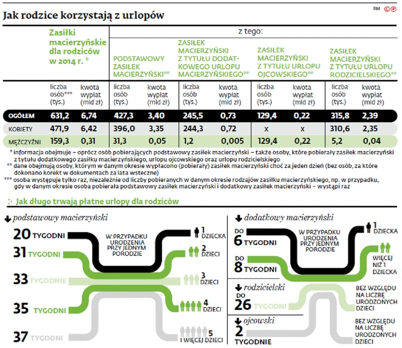 Choć samozatrudnieni i pracujący na umowach cywilnoprawnych stanowili w 2014 r. tylko 11 proc. osób pobierających zasiłki za czas odpowiadający urlopowi rodzicielskiemu, to jednak otrzymali aż 19 proc. łącznej kwoty świadczeń. A to oznacza, że zasiłki dla takich osób były znacznie wyższe niż te otrzymywane przez pracowników. Przeciętnie – jak policzył DGP – aż o 86 proc. Łącznie ZUS wydał na ten cel 2,39 mld zł, przy czym 280 tys. pracowników pobrało łącznie 1,94 mld zł, a 35 tys. opłacających składkę chorobową z innej podstawy – 450 mln zł.