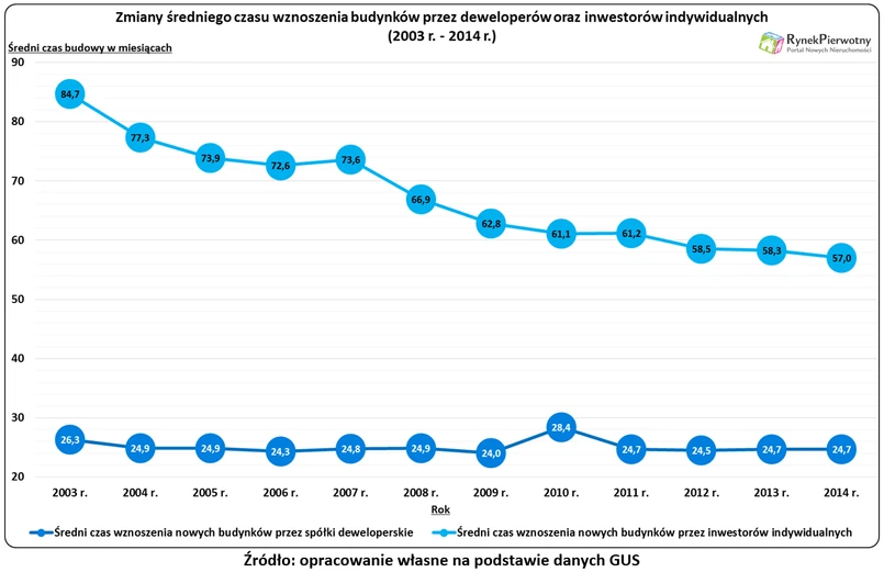 Dzięki informacjom zaprezentowanym na poniższym wykresie można sprawdzić, jak zmieniał się średni czas wznoszenia budynków przez deweloperów. Ta wartość była dość stabilna od 2004 roku (wynik: 24,9 miesiąca) do 2014 roku (wynik: 24,7 miesiąca). Spore odchylenia od przeciętnego poziomu (w 2003 r. i 2010 r.) prawdopodobnie są efektem mroźnej zimy, która na dłużej zatrzymała prace budowlane – tłumaczy Andrzej Prajsnar – analityk portalu RynekPierwotny.pl.