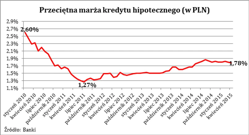 Z danych firmy Tax Care wynika natomiast, że marże kredytowe wzrosły w ciągu 12 miesięcy o 0,11 pkt. proc. Obecnie średnia marża kredytowa wynosi 1,78% (wynik dla 18 banków). Przy notowanym w połowie marca WIBOR-ze 3M na poziomie 1,65% średnie oprocentowanie kredytu hipotecznego można oszacować na zaledwie 3,43%. Jest to najniższy wynik w historii.