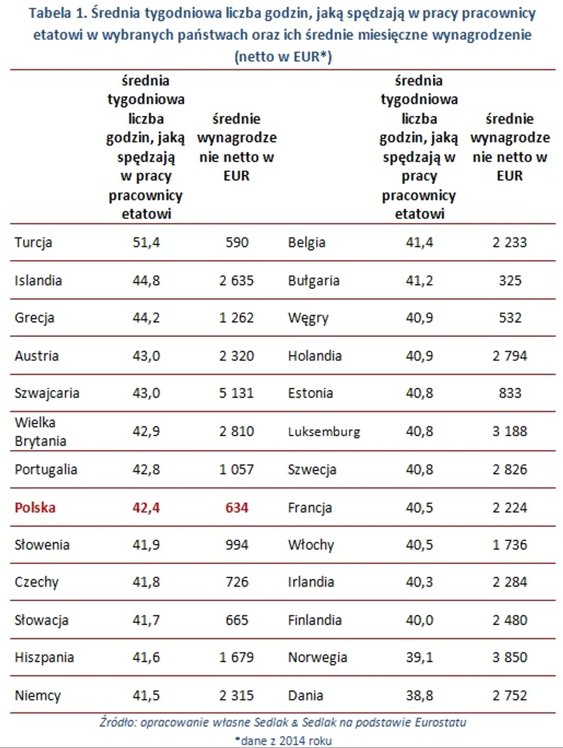 Z wybranych krajów europejskich w 2014 roku najdłużej pracowali mieszkańcy Turcji – wynika z danych opublikowanych przez Eurostat. Średni tygodniowy czas pracy osoby, która była zatrudniona na pełen etat, wyniósł 51,4 godziny. Mimo że Turcy pracują tak długo, średnia ich miesięcznych wynagrodzeń jest jedną z najniższych w zestawieniu. Przeciętnie otrzymują oni 590 EUR netto na miesiąc. Prawie cztery i pół razy wyższe średnie pensje dostają mieszkańcy Islandii – 2 635 EUR netto miesięcznie. Mieszkańcy tego kraju również długo pracują – przeciętnie 44,8 godzin tygodniowo. Zatrudnieni na pełen etat Polacy przeciętnie spędzają w pracy 42,4 godziny. Oznacza to, że przy 40 godzinnym tygodniu pracy, 2,4 godziny są to nadgodziny. Przy czym nasze średnie miesięczne zarobki w przeliczeniu wynoszą 634 EUR netto miesięcznie.