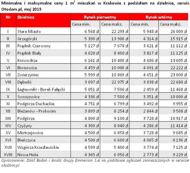 W celu stworzenia listy najtańszych mieszkań na sprzedaż w Krakowie przeanalizowano oferty z serwisu Otodom.pl. Poniższa tabela przedstawia zestawienie minimalnych i maksymalnych cen mieszkań w Krakowie w przeliczeniu na 1 m2 z podziałem na dzielnice oraz rynek – pierwotny i wtórny.
