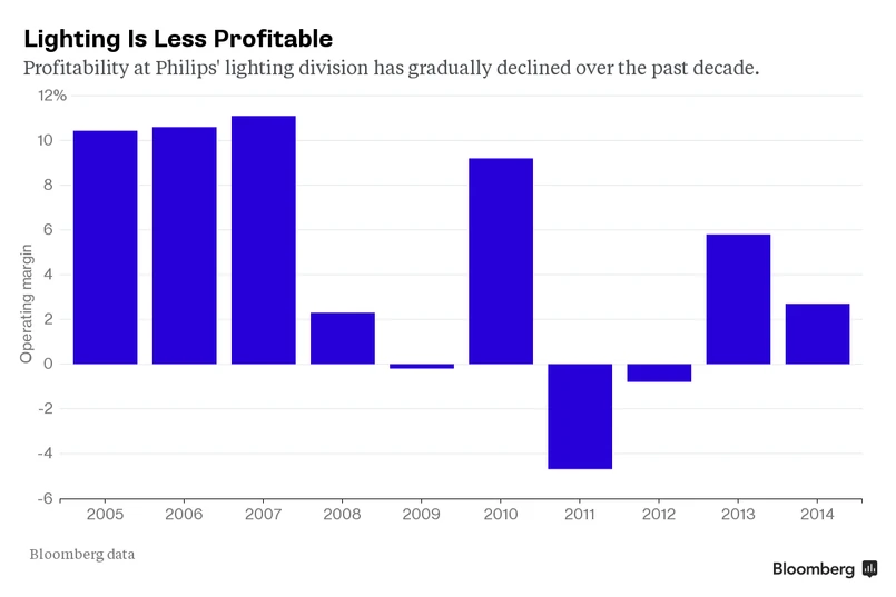 W ciągu ostatniej dekady, marża operacyjna Philipsa w segmencie oświetlenia zanurkowała z 10,5 proc. w 2005 roku do zaledwie 2,7 proc. w 2014 roku.