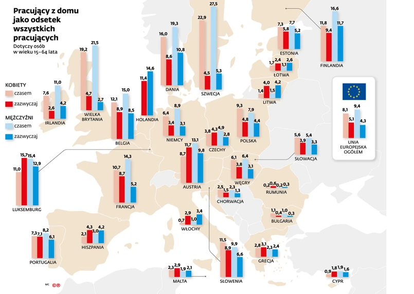 Ta forma pracy jest szczególnie popularna w sektorach finansowym i ICT, gdzie z tej opcji korzystają pracownicy w dziewięciu na 10 firm. Zresztą lista zawodów, których przedstawiciele najczęściej wykonują pracę zdalną, jest podobna w całej Europie: to m.in. architekci, prawnicy, tłumacze, programiści, graficy komputerowi, księgowi, telemarketerzy, projektanci, doradcy podatkowi i dziennikarze.