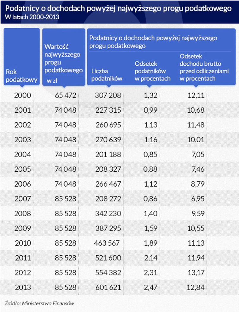 Ministerstwo Finansów informuje o liczbie podatników opodatkowanych w przedziałach opisanych progami podatkowymi. Do 2008 roku obowiązywały trzy przedziały i dwa progi podatkowe, od 2009 roku dwa przedziały i jeden próg.