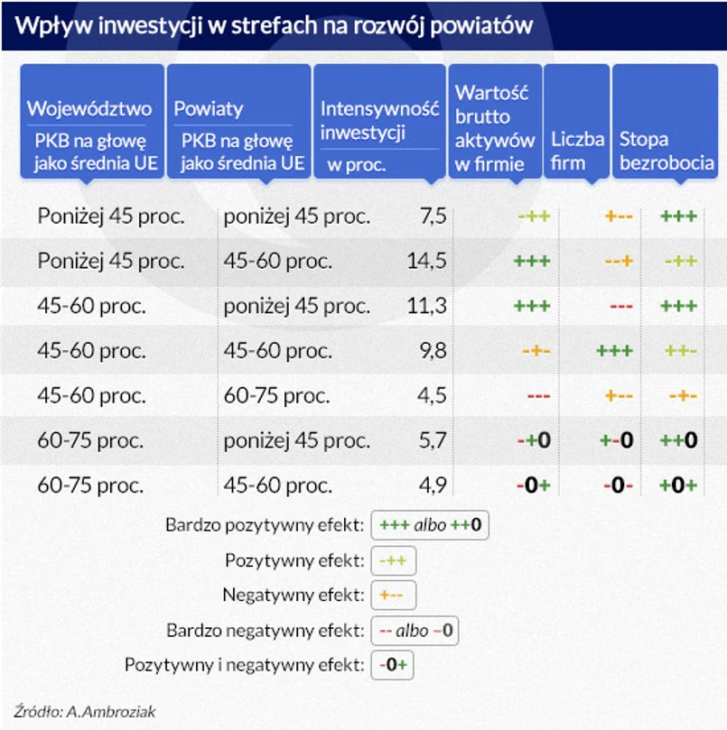 Za wpływ SSE na rozwój powiatów autor uznał zmiany w grupie kontrolnej (bez stref) w porównaniu ze zmianami zaobserwowanymi w grupie eksperymentalnej w latach 2005-13. W grupie eksperymentalnej okazało się, że w trzech podgrupach całkowita wartość brutto majątku firm była wyższa o nie więcej niż 5 proc., w kolejnych trzech była o 5-20 proc. wyższa, a tylko w trzech była o ponad 20 proc. wyższa.