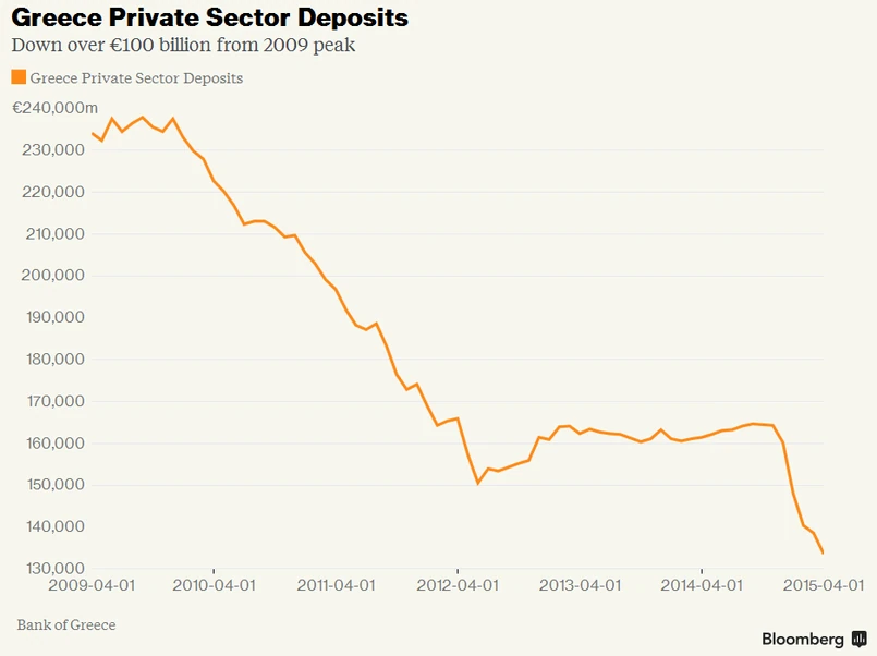 Prywatne depozyty Greków skurczyły się do najniższego poziomu od września 2004 roku. Klienci banków obawiają się że stracą swoje oszczędności, jeśli brak postępów w negocjacjach na temat pomocy finansowej dla Grecji doprowadzi ostatecznie do wyjścia tego kraju ze strefy euro i ponownej denominacji depozytów na drachmy.