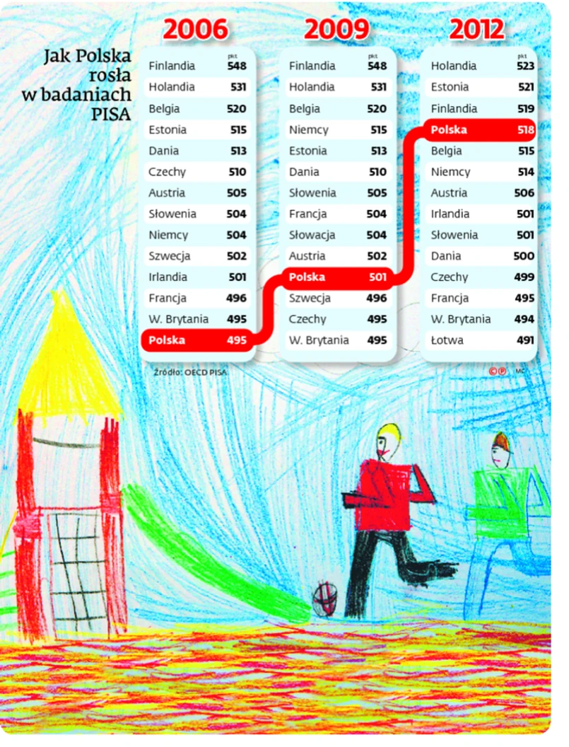 To, jak zdolne mamy dzieci, można zweryfikować w międzynarodowych badaniach. Największe z nich, przeprowadzany przez OECD pomiar umiejętności piętnastolatków PISA, pokazuje skok, jaki dokonał się w naszej edukacji w ostatnich latach. Analiza prowadzona jest co trzy lata. W pierwszej edycji badania, w 2000 r., Polska znajdowała się w trzeciej dziesiątce wśród krajów OECD, niżej niż USA we wszystkich ocenianych obszarach: czytania ze zrozumieniem, rozumowania w naukach przyrodniczych i matematyki. Trzy lata później prześcignęliśmy Stany, a w 2012 r. byliśmy już blisko czołówki – na 10. miejscu w czytaniu, 13. w matematyce i 9. w naukach przyrodniczych. Wyprzedzają nas tylko kraje dalekowschodnie i Skandynawia, gdzie od lat systemy edukacyjne funkcjonują bardzo dobrze.