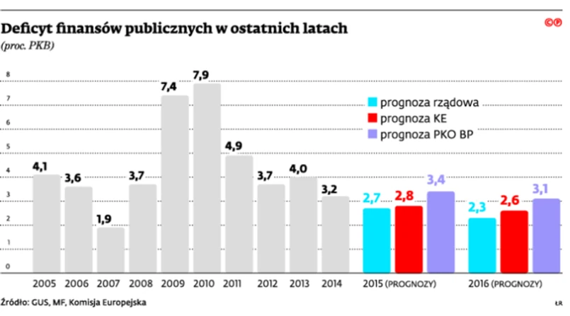 Eksperci banku w swoich wyliczeniach idą nawet dalej. Według nich zdjęcie z Polski procedury nadmiernego deficytu i bieżąca sytuacja polityczna zachęcą rząd do fiskalnego popuszczenia pasa. Na tyle dużego, że deficyt finansów publicznych, zamiast spaść w tym roku do 2,7 proc. PKB (jak szacuje MF), wzrośnie do 3,4 proc. PKB. Co więcej, w 2016 r. nie będzie spadku deficytu poniżej 3 proc. PKB (MF zakładało 2,3 proc. PKB, Komisja Europejska do 2,6 proc. PKB). Skalę tego rozluźnienia bank wylicza na 0,5–1 proc. PKB w tym roku, czyli – przeliczając to na złotówki – 8,5–17 mld zł. – To nie przełoży się proporcjonalnie na wzrost deficytu w takiej samej skali, bo część wydatków – zwłaszcza infrastrukturalnych – pozytywnie zadziała na wzrost PKB i wróci do budżetu w postaci podatków – uspokaja Michał Rot. ©?