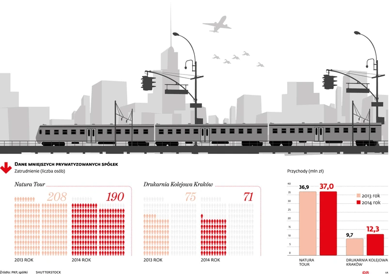 Pierwsza z tych firm zajmuje się organizacją pobytów w należących do PKP nadmorskich i górskich ośrodkach wypoczynkowych, utrzymując biura podróży w ośmiu miastach. W 2014 r. przyniosła 37 mln zł przychodu. Druga firma to Drukarnia Kolejowa Kraków: zakład poligraficzny, który zatrudnia ponad 70 pracowników, a w ubiegłym roku miał ponad 12 mln zł obrotu. – Sprzedaż tych spółek to słuszna decyzja. Do zmiany właściciela powinno dość jak najszybciej, bo obie firmy zajmują się działalnością spoza podstawowego biznesu PKP – ocenia Jakub Majewski, prezes fundacji Pro Kolej.