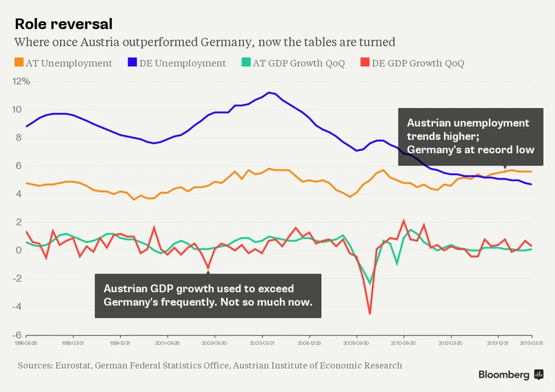 Od kiedy w 2005 roku na łamach niemieckiego magazynu „Stern” pojawił się artykuł wychwalający austriacką gospodarkę, wzrost PKB tego kraju zaczął systematycznie hamować.