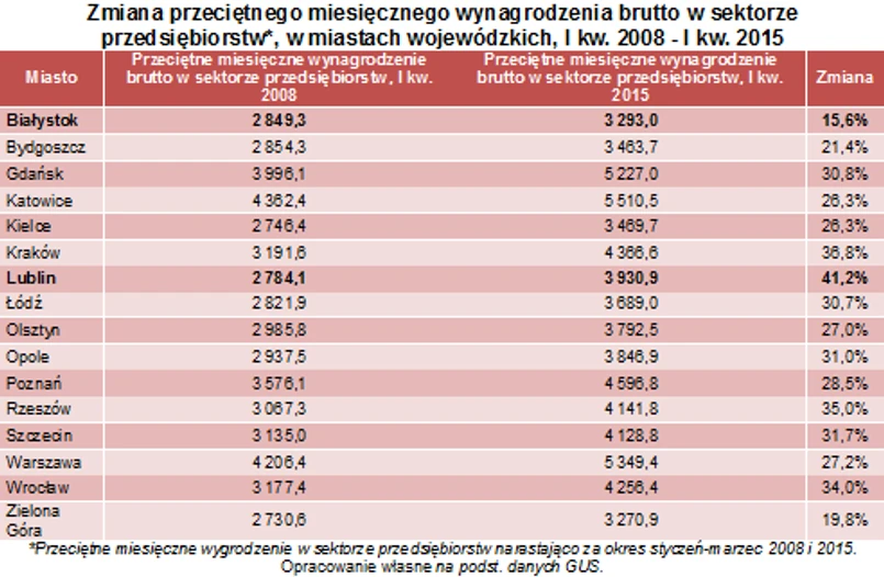 W gronie miast wojewódzkich największe powody do zadowolenia powinni mieć mieszkańcy Lublina, gdyż tam w ciągu ostatnich siedmiu lat zarobki brutto wzrosły najbardziej, ich przyrost przekroczył 40%. Na drugim biegunie znalazł się Białystok i Zielona Góra, gdyż tylko w tych dwóch miastach odnotowano przeciętne podwyżki wynoszące mniej, niż jedną piąta pensji. Warto także zauważyć, że najwyższe zarobki nie występują, jak podpowiadałby zdrowy rozsądek w Warszawie, ale w ... Katowicach.