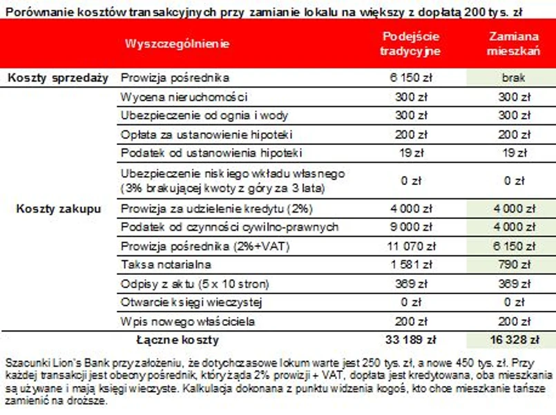Przewagą takiej zamiany nad podejściem tradycyjnym są niższe podatki, koszty prowizji czy obsługi notarialnej. Nie brakuje jednak też minusów. Chodzi szczególnie o niewielką liczbę ofert. Dla przykładu na jednym z dużych portali internetowych publikującym oferty, tych dotyczących zamiany mieszkań w Warszawie jest jedynie kilkadziesiąt, podczas gdy ofert sprzedaży na tej samej witrynie jest kilkadziesiąt tysięcy. Ofert zamiany może być oczywiście więcej, ponieważ tego typu ogłoszenia mogą często pojawiać się jedynie na tablicach informacyjnych czy w gazetach, a nie na portalach internetowych. Niemniej wybór mieszkań do zamiany jest ograniczony, co nie znaczy jednak, że nie warto szukać. Wszystko za sprawą wcześniej wspomnianych kosztów. Przede wszystkim w przypadku transakcji zamiany osoby korzystające z pomocy pośrednika płacą prowizję tylko raz, a nie dwa razy jak w podejściu tradycyjnym (raz przy sprzedaży i raz przy zakupie). Do tego dochodzi niższy podatek od czynności cywilno-prawnych. Płaci się go bowiem nie od wartości kupowanej nieruchomości, a jedynie od różnicy wartości zamienianych praw. Na koniec pozostaje jeszcze notarialna taksa. Co prawda można dowolnie ustalić kto ją płaci, ale często w przypadku transakcji zamiany taksę (liczoną od wartości droższej nieruchomości) strony dzielą między sobą po równo.