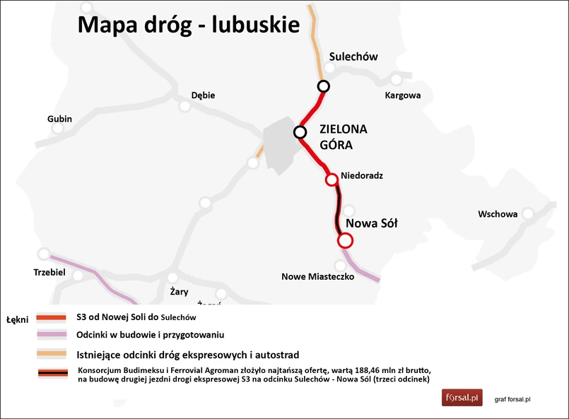 Konsorcjum Budimeksu i Ferrovial Agroman złożyło najtańszą ofertę, wartą 188,46 mln zł brutto, na budowę drugiej jezdni drogi ekspresowej S3 na odcinku Sulechów - Nowa Sól (trzeci odcinek od km 299+350 do km 316+640), podała Generalna Dyrekcja Dróg Krajowych i Autostrad.