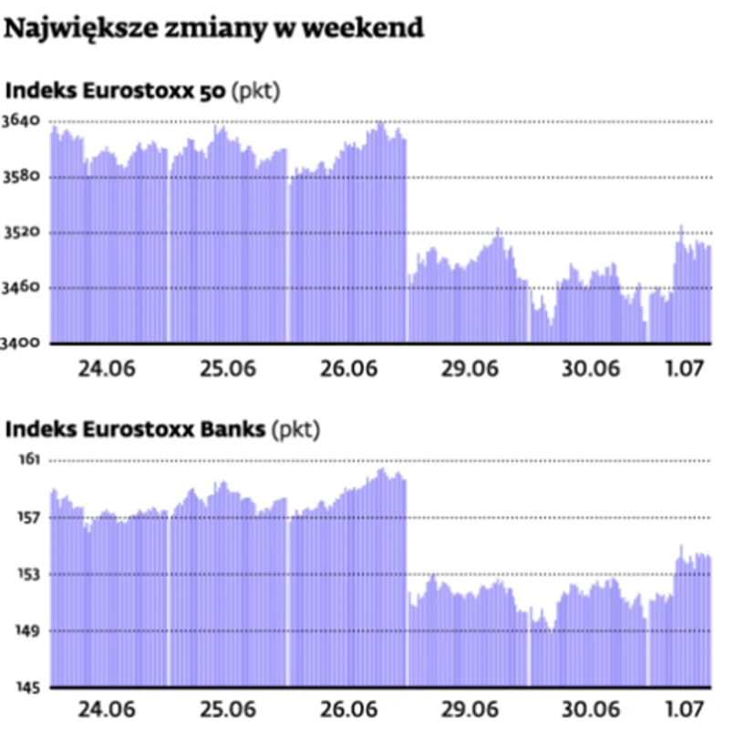 Z punktu widzenia inwestorów na rynkach finansowych kluczowy był miniony weekend. Pojawiające się wówczas informacje o fiasku negocjacji z Grecją, a wcześniej o rozpisaniu przez premiera Aleksisa Tsiprasa referendum w sprawie propozycji MFW, Komisji Europejskiej i Europejskiego Banku Centralnego, mocno przybliżały niewypłacalność Aten i możliwość opuszczenia przez Greków strefy euro. Efekt: natychmiast po otwarciu w poniedziałek rynków walutowych w Azji (w Europie był późny niedzielny wieczór) euro wyraźnie osłabło wobec franka szwajcarskiego i dolara.