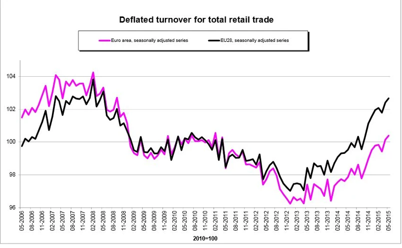 Sprzedaż detaliczna wyrównana sezonowo w strefie euro wzrosła o 0,2 proc. miesiąc do miesiąca w maju 2015 r. W całej Unii Europejskiej było to 2,4 proc. Analitycy spodziewali się, że sprzedaż w Eurolandzie wzrośnie 0,1 proc. wzrostu w ujęciu miesięcznym.