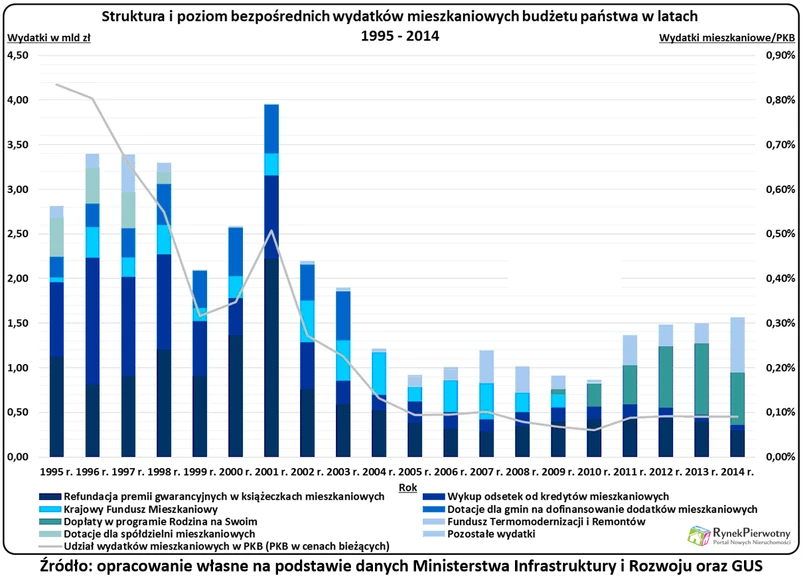 Ministerstwo Infrastruktury i Rozwoju udostępnia szczegółowe zestawienie środków przeznaczonych na „mieszkaniówkę” (lata 1995 – 2014). Dane MIiR dotyczą dwudziestu kolejnych budżetów. W każdym z nich kwota bezpośrednich wydatków na cele mieszkaniowe wynosiła od 0,86 mld zł (2010 r.) do 3,96 mld zł (2001 r.). Dzięki informacjom przedstawionym na wykresie można zauważyć, że rekordowy wynik z 2001 r. był rezultatem dużej premii dla posiadaczy książeczek mieszkaniowych i wykupu odsetek w wielu kredytach ze starego portfela – tłumaczy Andrzej Prajsnar, analityk portalu RynekPierwotny.pl.