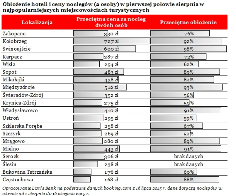 Popularność poszczególnych miast ma wyraźne przełożenie na ceny, jakie trzeba płacić za noclegi. Szacunki Lion’s Bank oparte o dane z serwisu booking.com sugerują, że najwięcej za dobę dwie osoby musiałyby zapłacić w Kołobrzegu – średnio 727 zł. Tak wysoki wynik może oczywiście częściowo wynikać z faktu, że najtańsze oferty zostały już wykupione.