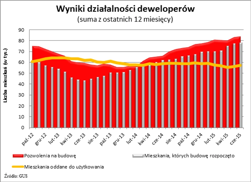 W całym sektorze budownictwa mieszkaniowego wyniki w dużej mierze są uzależnione od tych notowanych przez deweloperów. W czerwcu 2015 r. wydano pozwolenia na budowę 16,4 tys. mieszkań, a więc o 12% więcej niż w analogicznym okresie rok wcześniej. Rozpoczęto budowę 14,4 tys. lokali, a więc 6,7% więcej niż rok wcześniej. Liczba mieszkań oddanych do użytkowania wzrosła natomiast o 16,6% (do 12 tys.).