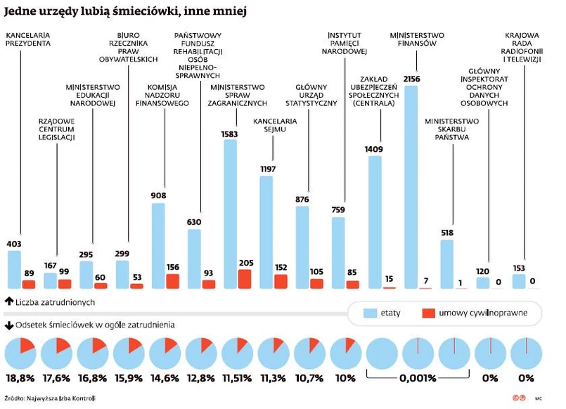 Na drugim końcu są Biuro Generalnego Inspektora Ochrony Danych Osobowych i Biuro Krajowej Rady Radiofonii i Telewizji. Te instytucje nie zatrudniły na śmieciówkach ani jednej osoby.