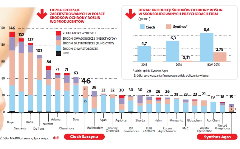 W przyjętej pod koniec ub.r. strategii grupy Ciech na lata 2014–2019 zapisano, że – poza rozwojem w sektorze sodowym – ważnym zadaniem firmy jest „podwojenie udziałów w polskim rynku środków ochrony roślin”. Z kolei nadrzędnym celem firmy Synthos Agro (powstała w zeszłym roku z przekształcenia spółki Synthos Dwory 6) jest „zdobycie jak największego udziału w światowym rynku środków ochrony roślin w możliwe krótkim czasie”. Oczywiście producent zaczyna od Polski. W 2014 r. na naszym rynku firma ulokowała dwie trzecie swojej produkcji, resztę – za granicami.