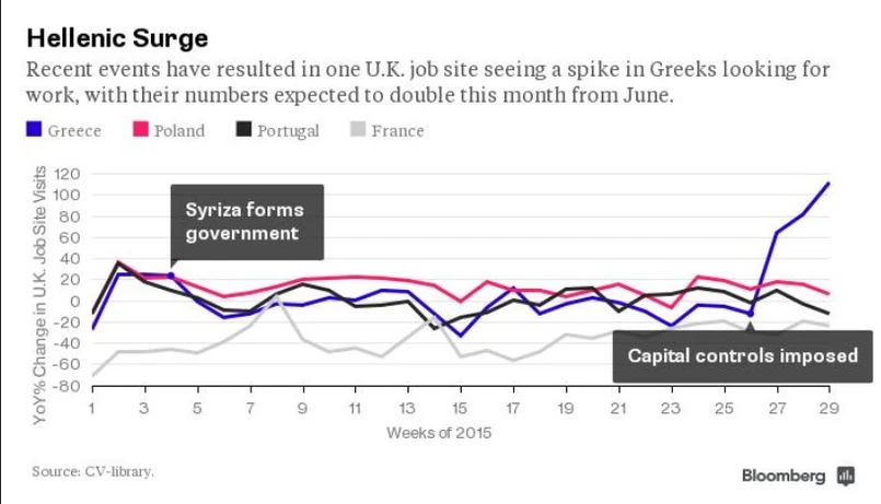 Jeszcze przed ogłoszeniem kontroli przepływu kapitału, CV-library notowała tyle samo internetowych wizyt ze strony Greków, co Portugalczyków. Greków poszukujących pracy w Wielkiej Brytanii było wówczas o połowę mniej niż Francuzów. Dziś liczba Greków przewyższa zarówno liczbę Portugalczyków jak i Francuzów. Pamiętajmy, że populacja Francji jest niemal sześć razy większa niż Grecji.