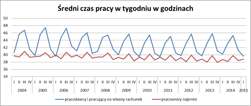 Ze względu na różnice w czasie pracy pomiędzy poszczególnymi kwartałami, konieczne jest uśrednienie danych, aby zobaczyć, jak długo pracują obie grupy. Wtedy okazuje się, że średni miesięczny czas pracy pracujących i pracodawców w roku 2014 wyniósł 42,5 godzin, a pracowników – najemnych 38,8 godzin. Różnica wynosi więc 3,7 godzin tygodniowo.