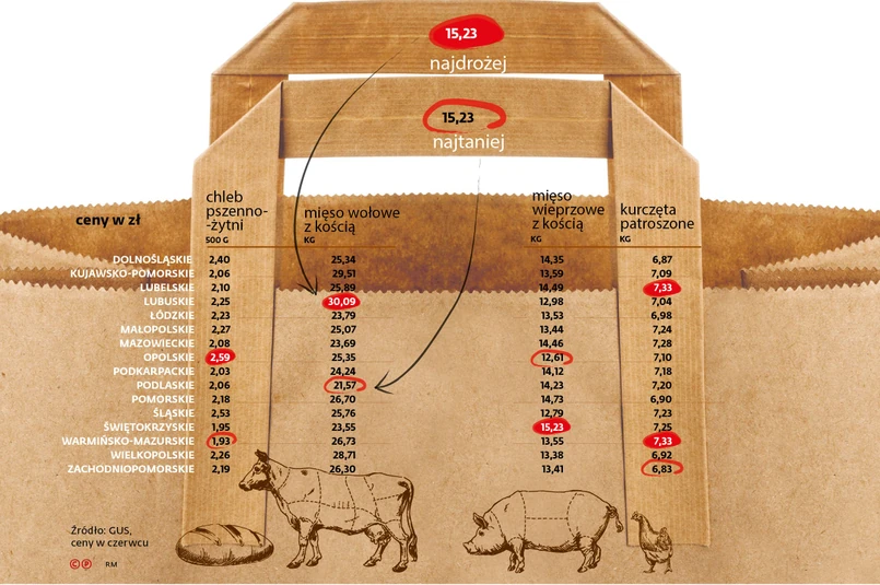 Chleb najdroższy jest na Opolszczyźnie i na Śląsku. Trzeba za niego zapłacić o jedną trzecią więcej niż w woj. warmińsko-mazurskim. Ale inne produkty żywnościowe są często najdroższe na terenach typowo rolniczych, które należą do najbiedniejszych i gdzie płace są na ogół znacznie niższe od średniej w kraju. Na przykład najwyższe ceny detaliczne mleka są w woj.: podkarpackim, podlaskim i warmińsko-mazurskim.
