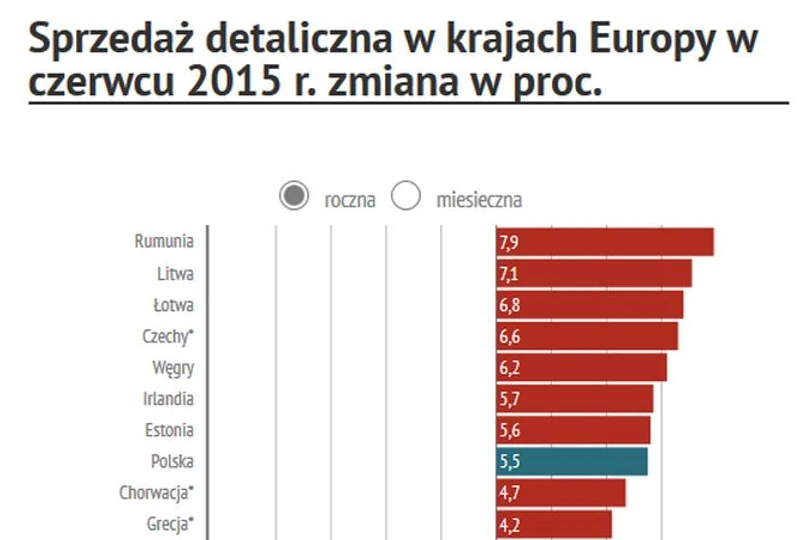 Eurostat podał, że w ujęciu rocznym sprzedaż detaliczna wzrosła w czerwcu o 1,2 proc. w strefie euro i o 2 proc. w całej UE. Konsensus dla strefy euro wynosił 1,9 proc. wzrostu r/r.