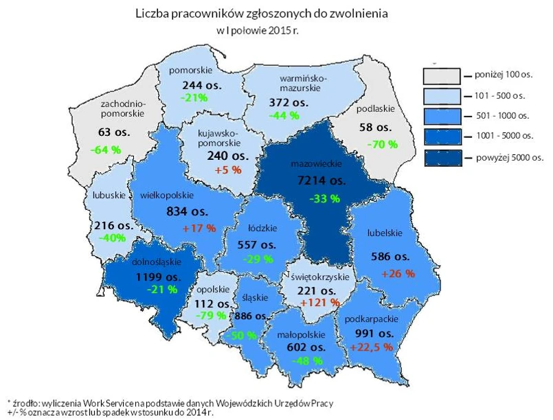 Największą redukcję miejsc pracy można zaobserwować w Mazowieckiem, w którym do zwolnienia zostało zgłoszonych ponad 7200 osób. Choć to znacznie mniej niż w 2014 roku, kiedy pracodawcy zredukowali ponad 10 tys. miejsc pracy, to i tak ten region jest niechlubnym liderem wśród innych województw. Również duża, bo licząca ponad 1 tys. osób grupa, została zgłoszona do zwolnienia w woj. dolnośląskim. Co ciekawe Mazowsze, Śląsk, a także Wielkopolska są jednocześnie regionami, w których jest aktualnie najwięcej rekrutacji i nowych ofert pracy.