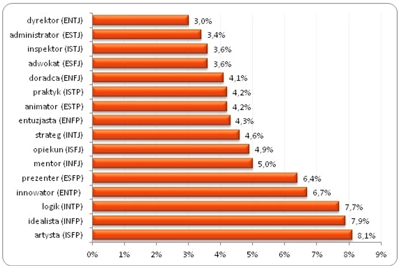 Duże ryzyko wystąpienia bezrobocia dotyczy również tzw. „idealistów” (INFP) i „logików” (INTP), gdzie odsetek bezrobotnych wyniósł odpowiednio 7,9 proc. i 7,7 proc. Na przeciwnym biegunie znaleźli się tzw. „dyrektorzy” (ENTJ) i „administratorzy” (ESTJ), gdzie odsetek osób pozbawionych pracy oscyluje wokół 3 proc. Ich korzystniejsza sytuacja na rynku pracy wiąże się prawdopodobnie z ich dużą wydajnością i determinacją w osiąganiu celów.