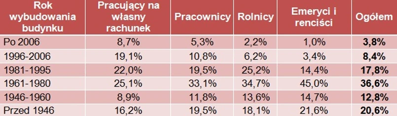Im lepsza sytuacja finansowa, tym nowsze mieszkanie. Wskazuje na to analiza wieku lokali mieszkalnych zamieszkiwanych przez poszczególne grupy społeczne. Blisko 28% gospodarstw domowych, których członkowie pracują na własnych rachunek zajmuje lokale powstałe w 1996 roku lub później. Są to najmłodsze mieszkania, a więc te w największym stopniu przystosowane do dzisiejszych wymogów, zapewniające największy komfort swoim mieszkańcom. W przypadku rolników odsetek ten wynosi już tylko nieco ponad 8%, a wśród emerytów i rencistów jedynie niecałe 4,5%.