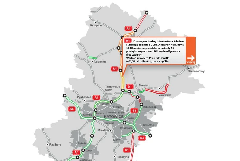 Śląski odcinek autostrady A1 został podzielony przez GDDKiA na cztery części. Strabag zrealizuje pierwszą z nich.