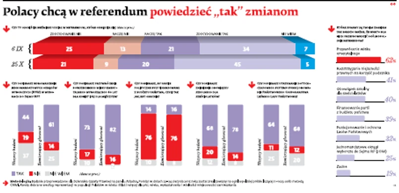 – Pytanie emerytalne ustawia wszystko. Dowodzi również, że referendum Andrzeja Dudy jest oceniane lepiej niż proponowane przez Bronisława Komorowskiego – komentuje wynik politolog dr Norbert Maliszewski. Jak pokazuje badanie, 42 proc. ankietowanych pozytywnie ocenia referendum z 6 września. W przypadku proponowanego na 25 października liczba pozytywnych ocen rośnie do 64 proc. Przekłada się to nie tylko na ocenę wniosku Dudy, ale także na wyższą deklarowaną frekwencję. To istotne zwłaszcza w odniesieniu do ankietowanych, którzy mówią, że na pewno pójdą do urn. W przypadku pierwszego referendum taką deklarację składa 34 proc., a drugiego 45 proc. Wyborcom nie przeszkadza, że głosowanie ma być połączone z wyborami parlamentarnymi. Pozytywnie ocenia ten fakt aż 70 proc. ankietowanych. Jedynie 21 proc. uważa, że to źle.