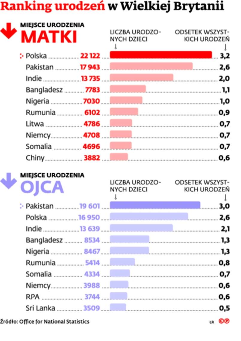 Polki po raz pierwszy pojawiły się w rankingu dziesięciu nacji z największą liczbą urodzeń w 2005 r., czyli rok po wejściu do UE i otwarciu przez Wielką Brytanię rynku pracy dla naszych obywateli. Nasze rodaczki urodziły wtedy 3400 dzieci i znalazły się na dziewiątym miejscu. Na podium awansowały dwa lata później, a od 2010 r. nieprzerwanie prowadzą. W przypadku mężczyzn taka statystyka jest prowadzona od 2008 r. Polacy zajmowali wtedy drugie miejsce za Pakistańczykami, z liczbą 13 tys. potomków. Taka kolejność utrzymuje się do dziś. Polacy stanowią przy tym największą grupę obcokrajowców na Wyspach – jest nas już 853 tys. Drugich w tej kategorii Hindusów jest 365 tys.