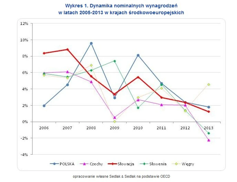 Realne płace w 2013 roku wzrosły w Polsce o 37 proc. w porównaniu z 2005 rokiem. Spośród analizowanych krajów tylko w Słowacji przyrost ten był wyższy o 3 p.p. Wzrost siły nabywczej wynagrodzenia wynika z tego, że pensje nominalne, czyli te wypłacane pracownikom, rosły szybciej niż ceny. Jednak w przypadku Słowenii i Czech, w ostatnim analizowanym roku, przyrost cen był zdecydowanie wyższy niż przyrost płac nominalnych. Sprawiło to, że realne pensje obywateli były niższe niż w 2012 roku.