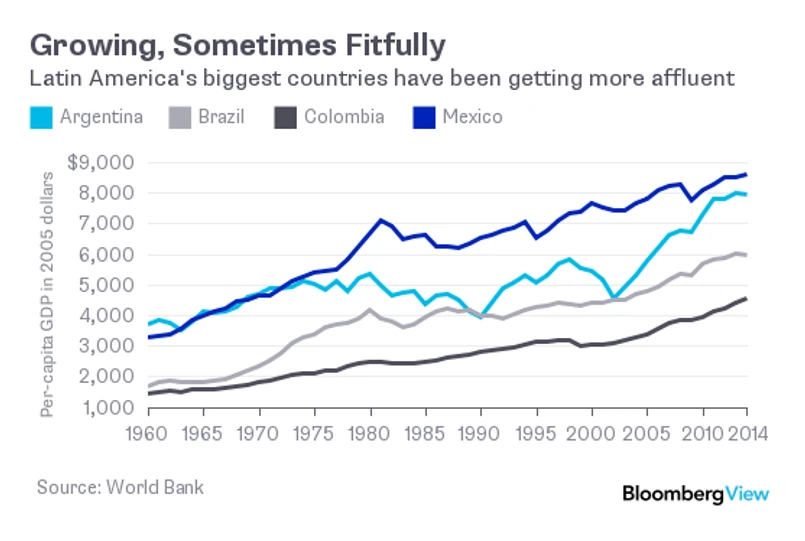 Wykres dla Argentyny jest najbardziej zmienny, co nie jest korzystne. W latach 60. XX wieku kraj ten był najbogatszy, a obecnie pod względem PKB per capita ustępuje nieznacznie Meksykowi. Argentyna doświadczyła jednakże kilku bardzo negatywnych gospodarczych okresów, między innymi podczas wojny z Wielką Brytanią oraz powtarzających się kryzysów finansowych. Dwa kraje o największej liczbie ludności w regionie, czyli Brazylia i Meksyk, rozwijały się stabilnie, ale z pewnością nie spektakularnie. Wygląda na to, że Kolumbia znalazła się w ciągu ostatniej dekady na zakręcie, chociaż jej głównym surowcem eksportowym jest ropa, więc ta sytuacja nie może utrzymywać się w nieskończoność.