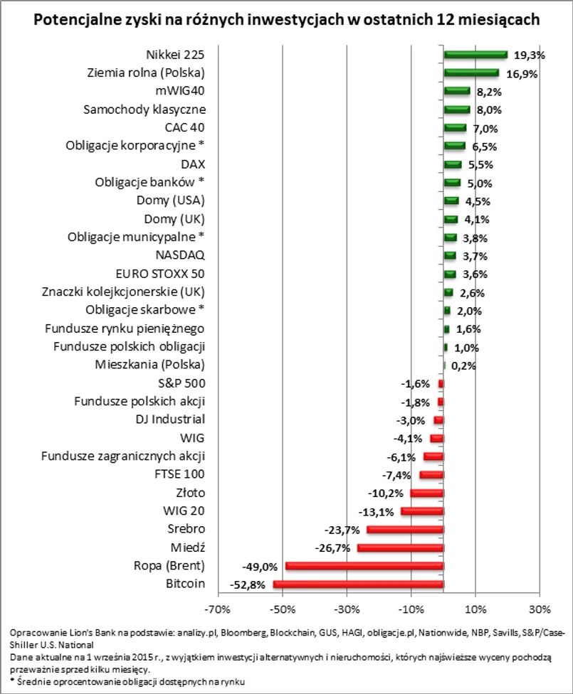 Przez ostatni rok najwięcej zarobili ci, którzy wybrali inwestycję na tokijskiej giełdzie. Może mieć to związek z tzw. luzowaniem ilościowym, prowadzonym przez japoński bank. Dostęp do taniego finansowania stymuluje popyt na akcje, a stąd już niedaleko do wzrostów na parkietach. W efekcie roczny wzrost notowań indeksu NIKKEI 225 wynosi aż 19,3% i to pomimo ostatniej korekty wywołanej niepokojem odnośnie sytuacji gospodarczej Chin. Sporo można było też zarobić inwestując w ziemię rolną. Szacunki Lion’s Bank oparte o najnowsze dane GUS sugerują, że w ciągu roku przeciętny hektar rodzimej ziemi rolnej zdrożał aż o 16,9% (dane za I kw. br.). Warto jednak pamiętać, że rynek ten czeka niemała rewolucja. Do niedawna zarówno inwestorzy, jak i rolnicy od lat cieszyli się dynamicznie rosnącymi cenami ziemi. Co więcej wiele osób liczyło na jeszcze więcej po maju 2016 roku. Wtedy to obywatele Unii mieli uzyskać możliwość swobodnych zakupów ziemi „nad Wisłą”. Aby temu przeciwdziałać wprowadzono jednak restrykcyjną ustawę. Jeden z jej zapisów mówi, że od 1 stycznia 2016 roku nabywcą rolnej działki w danej gminie będzie mogła być jedynie osoba, która od 5 lat jest zameldowana na terenie tejże gminy lub gmin ościennych. Takie obostrzenie powinno znacznie ograniczyć popyt na rolne działki, co może odbić się na ich cenach.