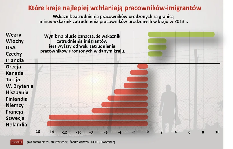 Powyższy wykres, który został przygotowany na podstawie danych zebranych przez Organizację Współpracy Gospodarczej i Rozwoju (OECD), niesie za sobą kilka innych niespodzianek. Holandia i Szwecja znajdują się na „samym dnie”, jeśli wziąć pod uwagę absorpcję imigrantów przez rynek pracy. Stany Zjednoczone, choć nie mogą pod tym względem równać się z Węgrami, są jednym z niewielu krajów, gdzie osoby urodzone za granicą znajdują zatrudnienie częściej niż rodowici mieszkańcy.