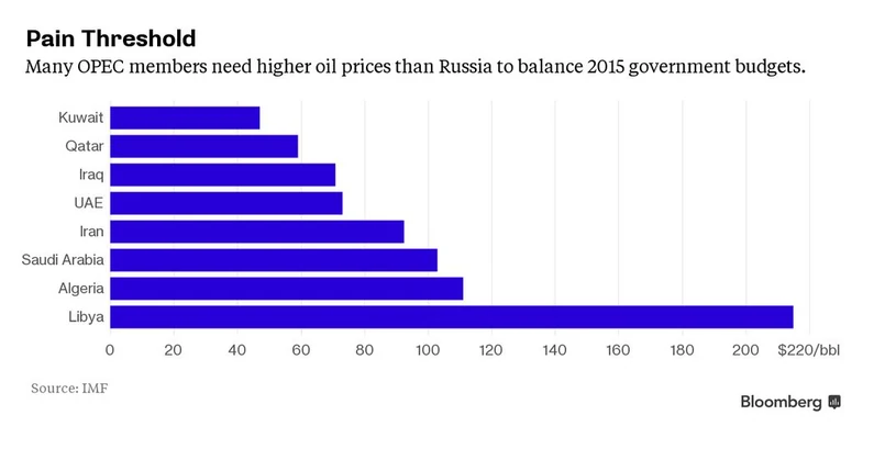 Podczas gdy większość członków OPEC, aby zrównoważyć swoje budżety, potrzebuje ceny na poziomie powyżej 100 dol. za baryłkę, Rosji wystarczy cena powyżej 60 dol. za baryłkę.